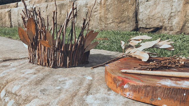 Endless possibilities of a stick: Sticks can be just about anything you want them to be. Tie some leaves or foliage to the end and use them as a natural paintbrush or magic wand. Create a wind catcher using twine, leaves, flowers and nuts. Old fabric, twine and leaves can create a family of stick people to use for imaginative play. Sticks can make letters and numbers and to add some risk, allow your children to explore wood whittling using a potato peeler; this works best on smooth, softer sticks and be sure to supervise.